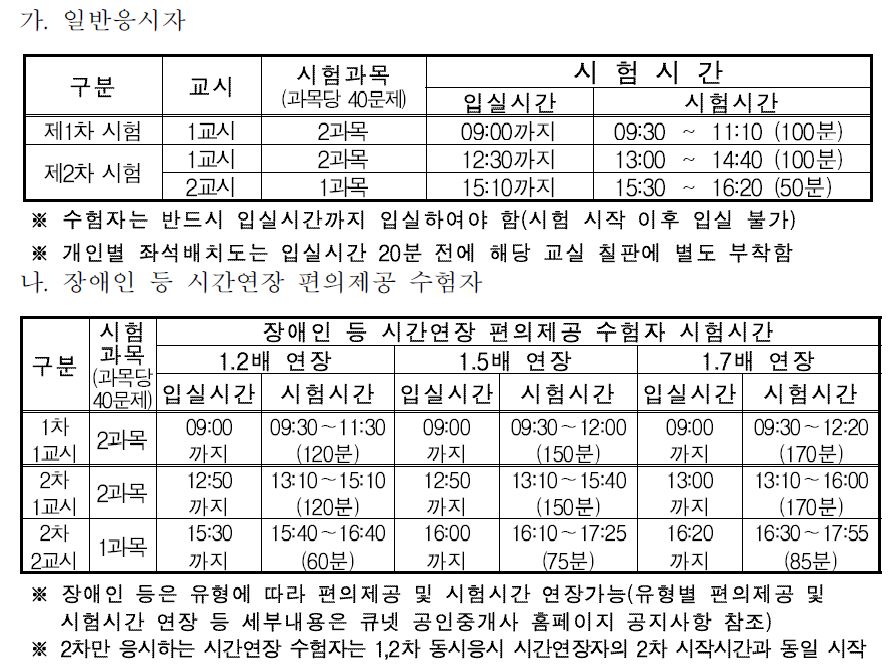 시험 시간은 1차 1교시 100분, 2차 1교시 100분, 2차 2교시 50분으로 1차, 2차 모두 응시하는 경우에 9시부터 오후 4시 20분까지 시험을 치러야 하는군요. 장애인 등 시간연장 편의제공 수험자의 경우 1.2배, 1.5배, 1.7배 연장 제도가 있네요. 시험 시간을 연장해주는 게 편의를 제공해주는 것 같으면서도 저 긴 시간 동안 시험을 치러야 한다고 하니, 개인적으로는 딱히 혜택이라는 생각이 들지 않습니다.