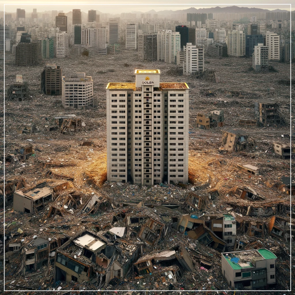 콘크리트 유토피아는 대규모 자연재해로 인해 서울의 황금아파트만 남겨둔 채 다른 아파트들이 무너지는 장면으로 시작한다. 이 장면은 성경 구절을 연상시키는 듯, 한국 서울의 아파트가 탐욕의 상징처럼 보이게 만든다. 이 영화는 주민들 사이의 갈등과 디스토피아적인 현실을 상징적으로 표현한다. 아파트가 무너진 후, 구조대를 기다리는 주민들과 탐욕에 눈이 멀어 자신의 이익만을 추구하는 주민들 사이의 대조적인 모습이 인상적이다. 아파트 내에서도 주민들은 자기 집을 가진 사람과 세를 사는 사람을 구분하려 한다. 이러한 구분은 상황의 아이러니와 우스꽝스러움을 드러낸다.