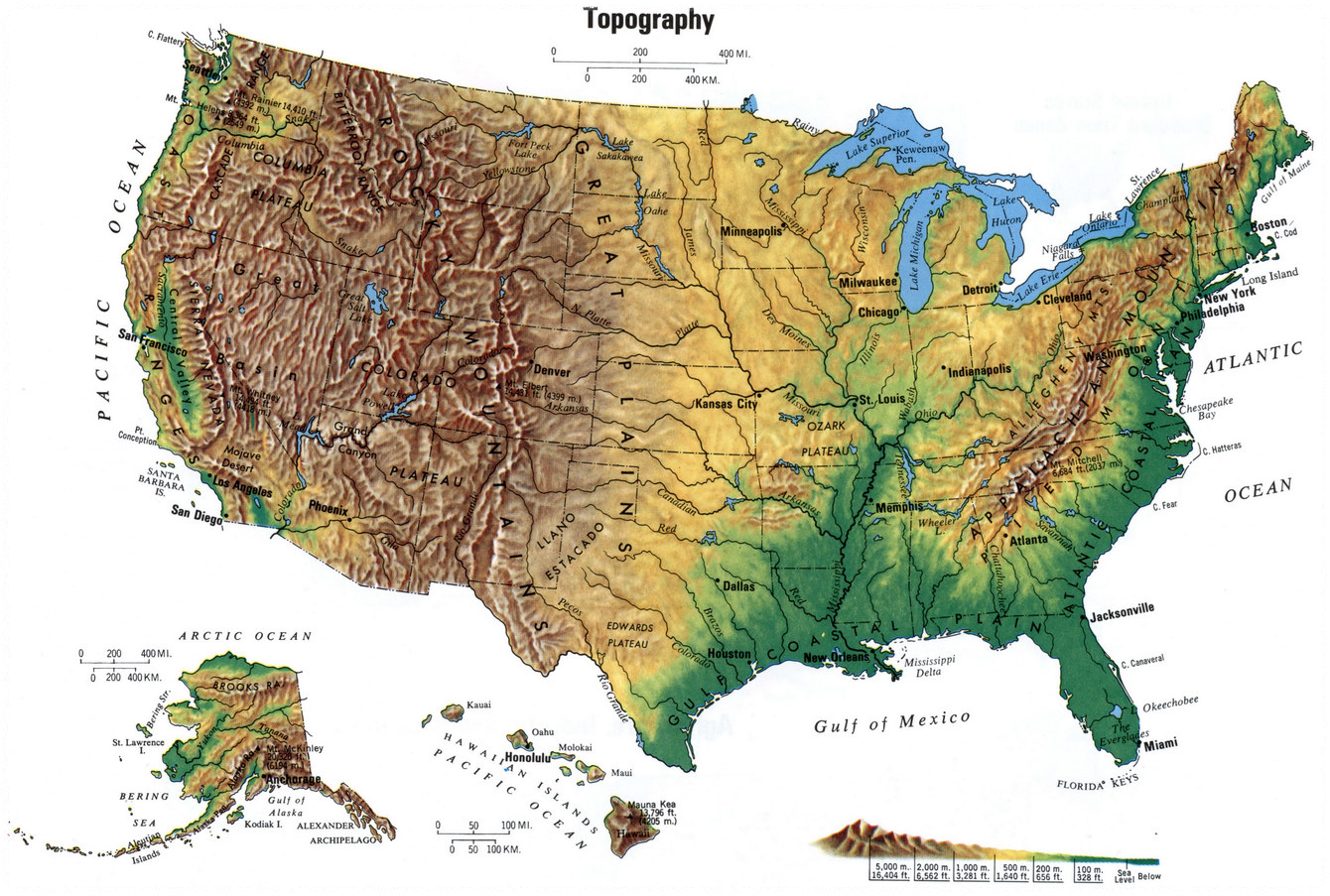 미국은 대서양과 태평양 사이에 자리 잡고 있다. 이 두 대양은 미국을 외부의 군사적 위협으로부터 보호하는 자연적 방어선 역할을 한다. 팀 마샬은 이를 "천혜의 방어선"(지리의 힘, p.89)이라 표현하며, 이러한 지리적 이점이 미국의 경제적, 군사적 발전에 기여했다고 강조한다.